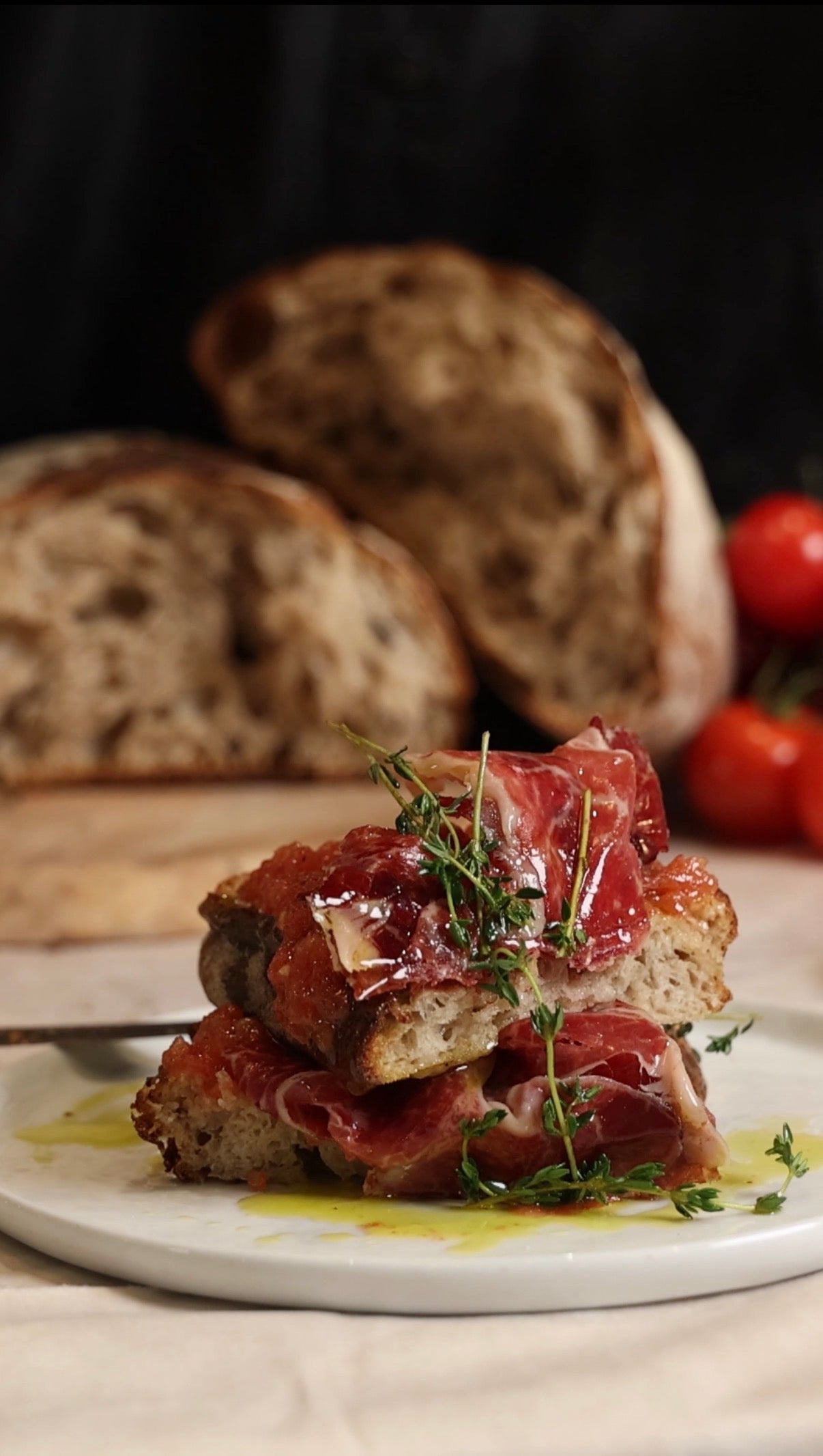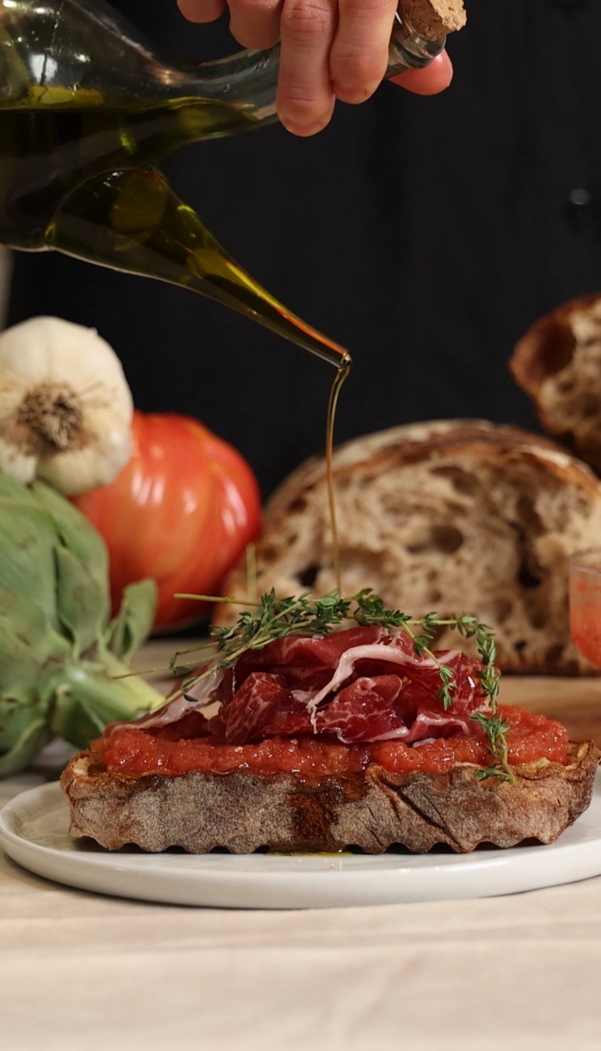 If you’ve ever visited Spain, you’ve probably had pan con tomate—the iconic Catalan-style tomato bread found everywhere from breakfast counters to tapas bars. At its core, it’s beautifully simple: toasted bread rubbed with ripe tomato, finished with good olive oil and a pinch of salt. Add jamón and you’ve got one of the most beloved bites in Spanish cuisine—minimal effort, maximum flavor.