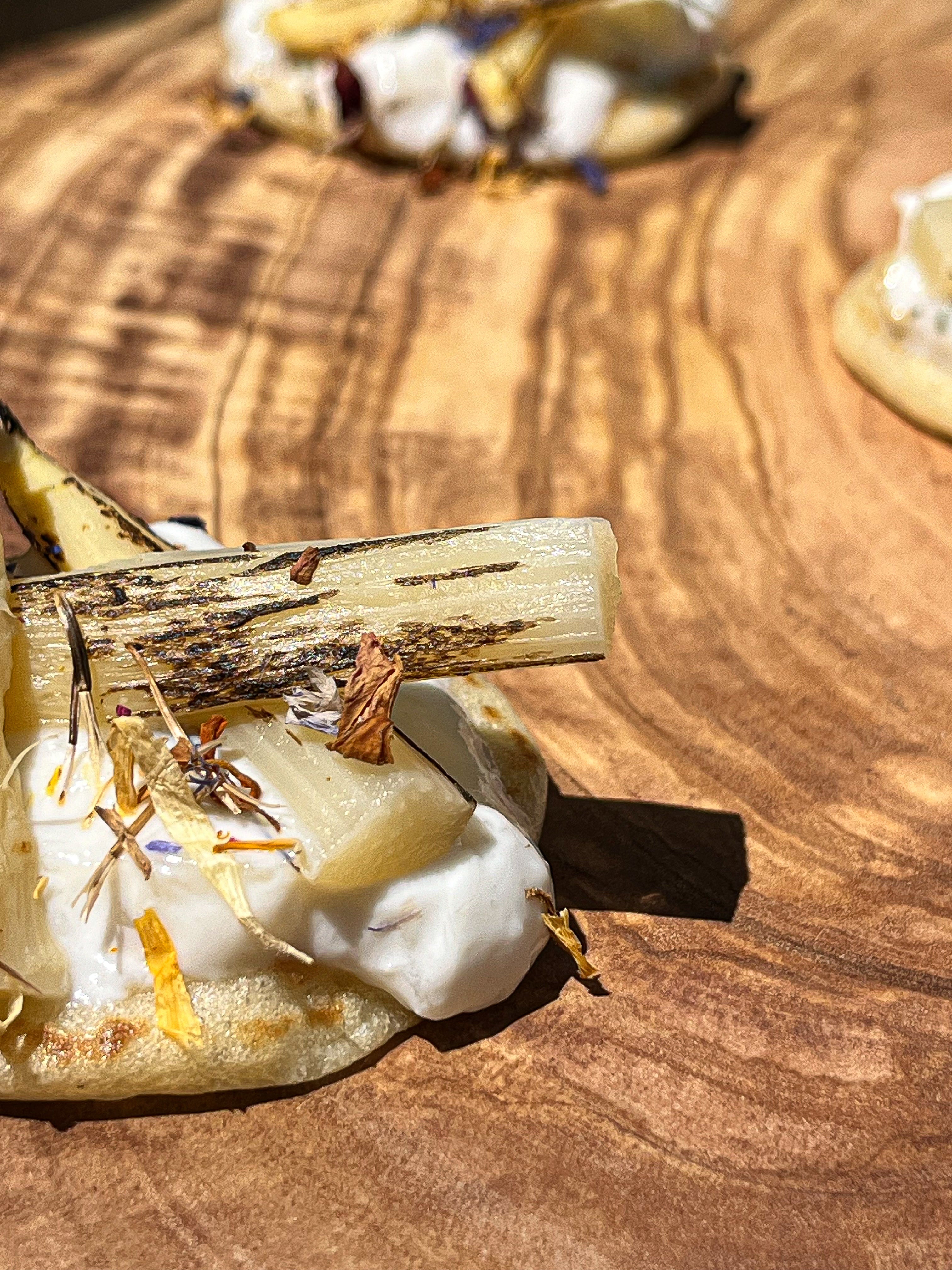 The real showstopper, however, are the torched white asparagus tips. Using a culinary torch, we lightly char the tips to bring out their natural sweetness and add a hint of smokiness. While the torch is optional, it provides a great charred effect if you have one handy. This step not only enhances the flavor but also adds an appealing visual contrast to the dish. Finally, an optional sprinkle of colorful dried edible flowers elevates the presentation, wowing your diners with a burst of color.