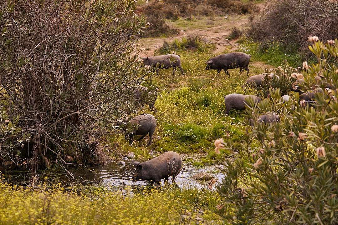 100% Ibérico Mamellado-lampiño pigs roam freely, feeding on acorns, herbs, and wild grasses. This natural environment and diet are essential to the quality and character of the final jamón.