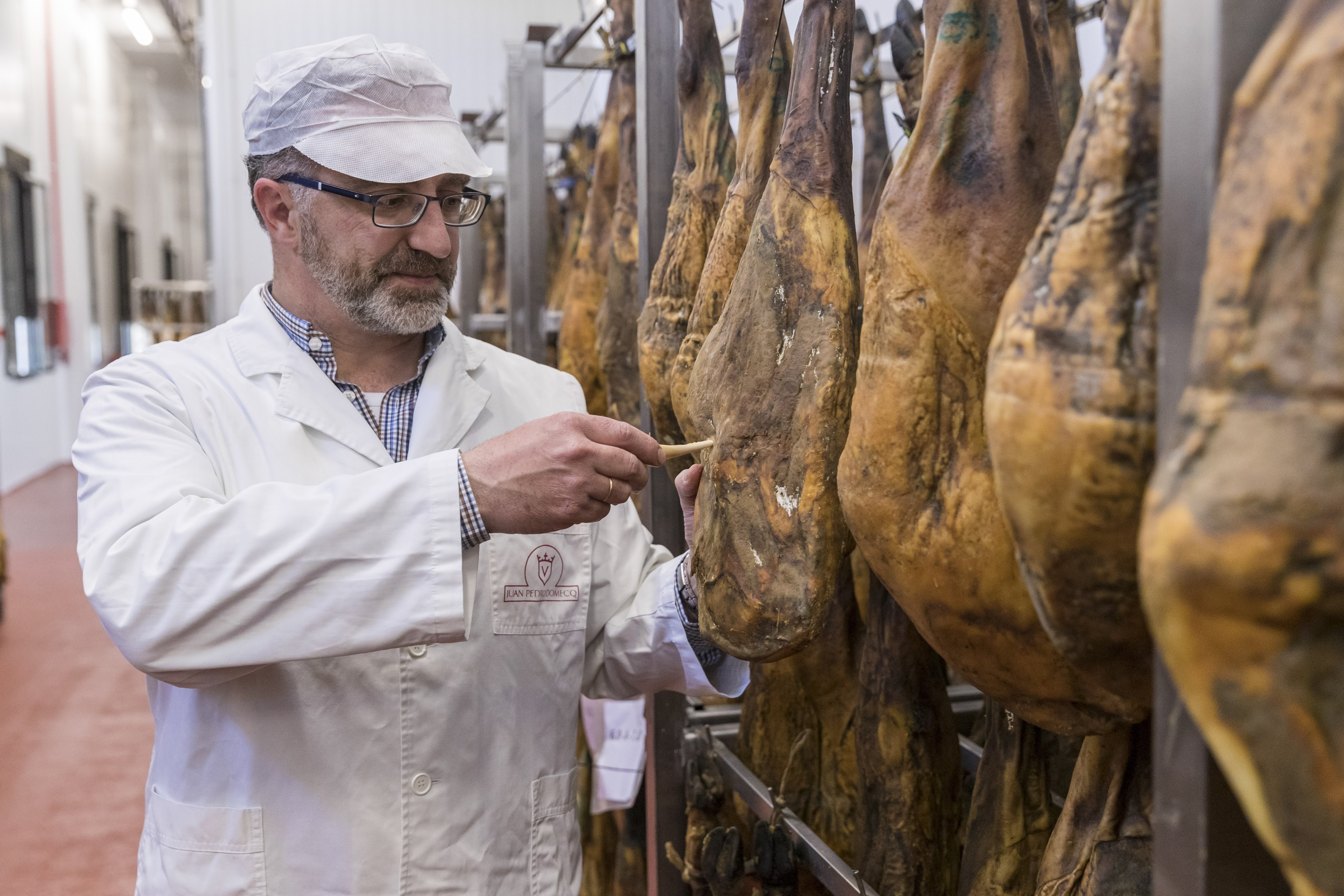 Every Juan Pedro Domecq jamón begins with time — over four years of patient, natural curing in mountain air, overseen by expert hands from start to finish. The process begins on the family’s estate in Jabugo, where the pigs roam freely, foraging on acorns during the montanera season. After careful selection and salting, the hams undergo a slow cure in cellars where temperature and humidity are controlled only by nature and tradition.