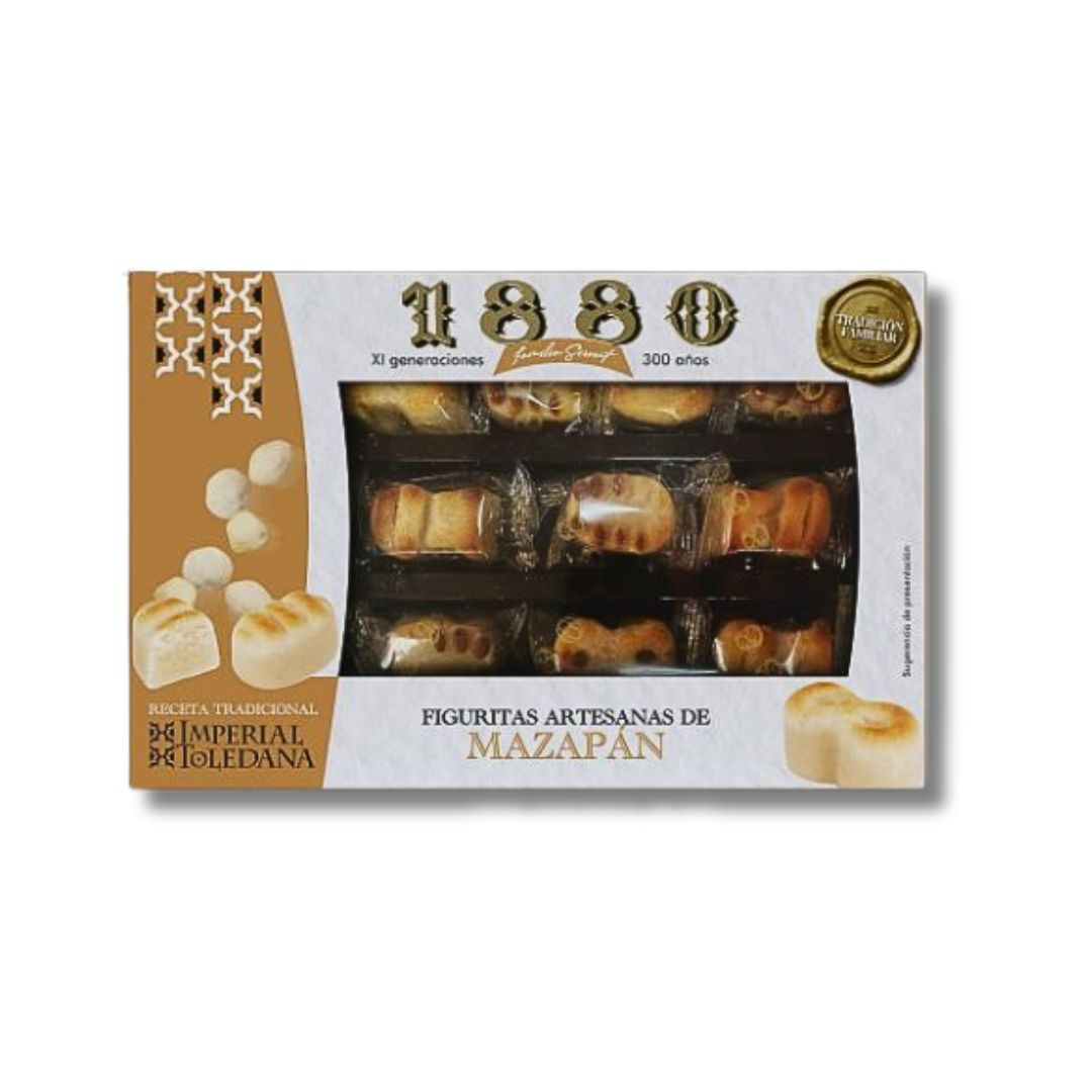 This is a box is composed of trays of individually wrapped marzipan delights featuring Marzipan Figurines, Marzipan covered with Pine Nuts, Almond sponge Cakes & Egg Yolk Portions.